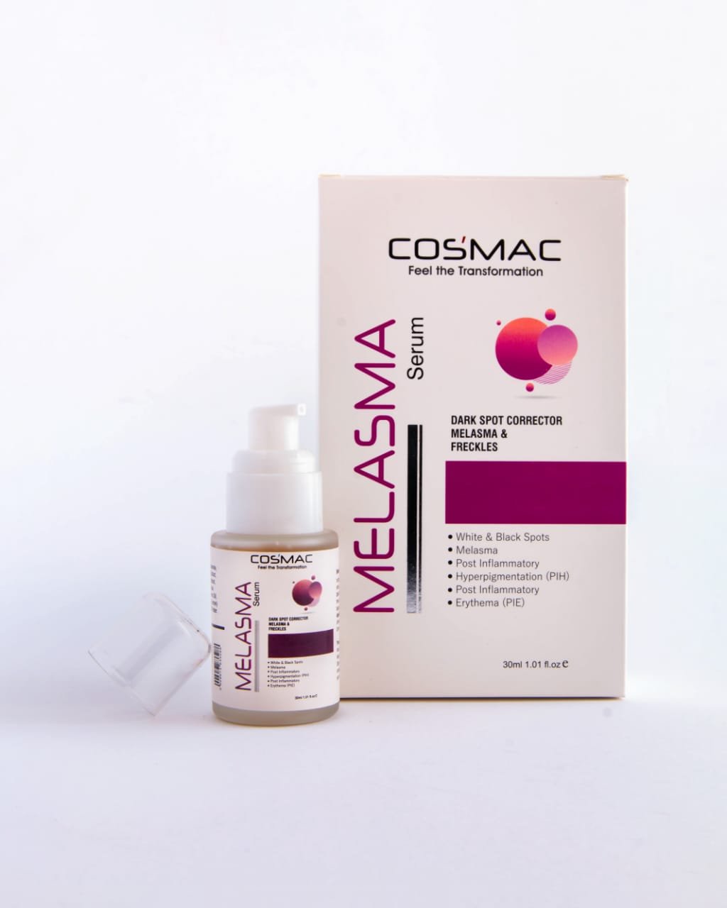 The COS’MAC Melasma Serum is a targeted dark spot corrector formulated to visibly reduce the appearance of hormonal melasma, freckles, and sun-induced pigmentation. It specifically addresses both PIH (Post-Inflammatory Hyperpigmentation—dark marks from old acne) and PIE (Post-Inflammatory Erythema—red or pink marks from recent inflammation), helping to restore an even, radiant complexion.