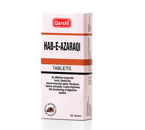 Hab-e-Azraqi tablets have nuxvomica as its active constituent for neuromuscular pains/myalgia and nervine debility. Hab-e-azraqi is an effective medicine for treatment of paralysis, tremor, neuromuscular pains and polio. Mode of action is through antagonizing inhibition response on nervine stimulation resulting to support stimulation. Also supports the vital organs of the body and improves the nervous system of body.