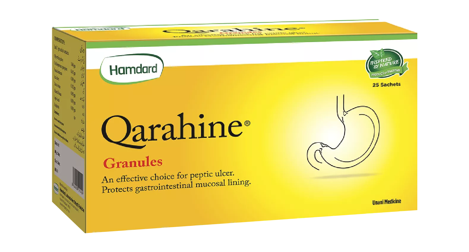 Qarahine is effective Unani preparation for Peptic and Gastric ulcer. It is the result of continued research on Unani ingredient by the Hamdard It is result of continued research on Unani ingredient by Hamdard . It is quite effective in management of Peptic and Gastric ulcer, acute and chronic Gastritis , Amoebic and Bacillary Dysentary and Diarhoea.